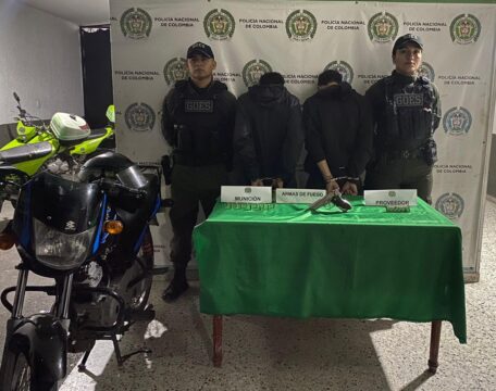 En una operación de registro y control llevada a cabo por el Grupo de Operaciones Especiales y Seguridad de Tránsito (GOEST) de la Policía en el sector Palmas de Santa Elena en Quimbaya, se logró la captura de dos hombres de 20 y 21 años de edad. La detención ocurrió cuando se interceptó una motocicleta en la que se desplazaban los sospechosos.